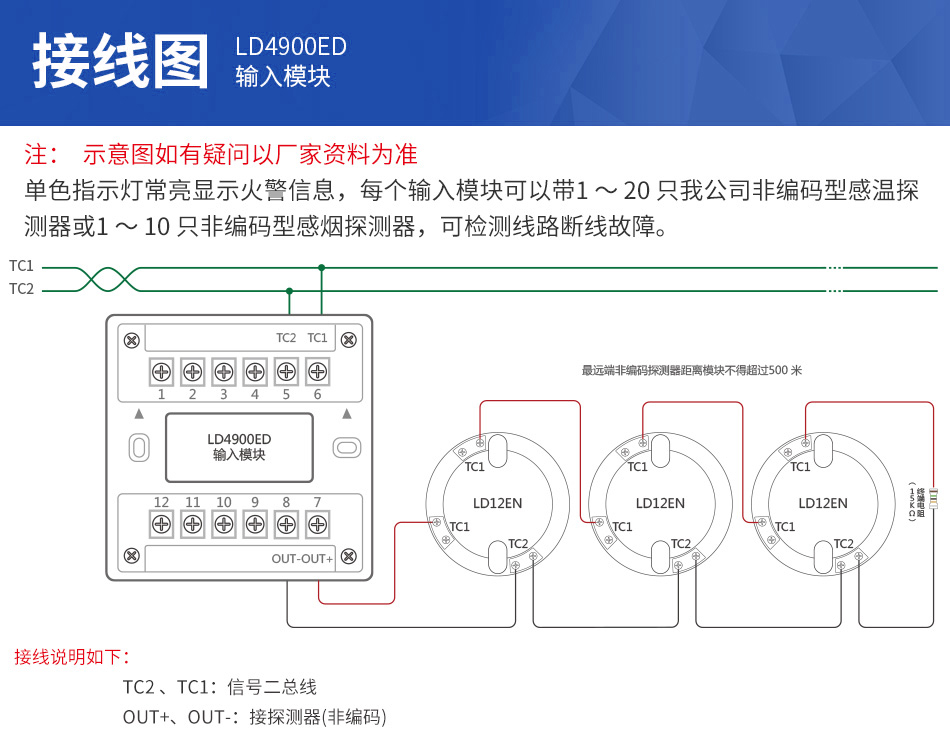 1、LD4900ED輸入模塊為二總線,無極性。 2、采用電子編碼,占一個(gè)節(jié)點(diǎn)地址(0~255)。 3、單色指示燈常亮顯示火警信息。 4、每個(gè)LD4900ED輸入模塊可以帶1~20只利達(dá)公司非編碼型探測器。 5、LD4900ED輸入模塊可檢測線路斷線故障。